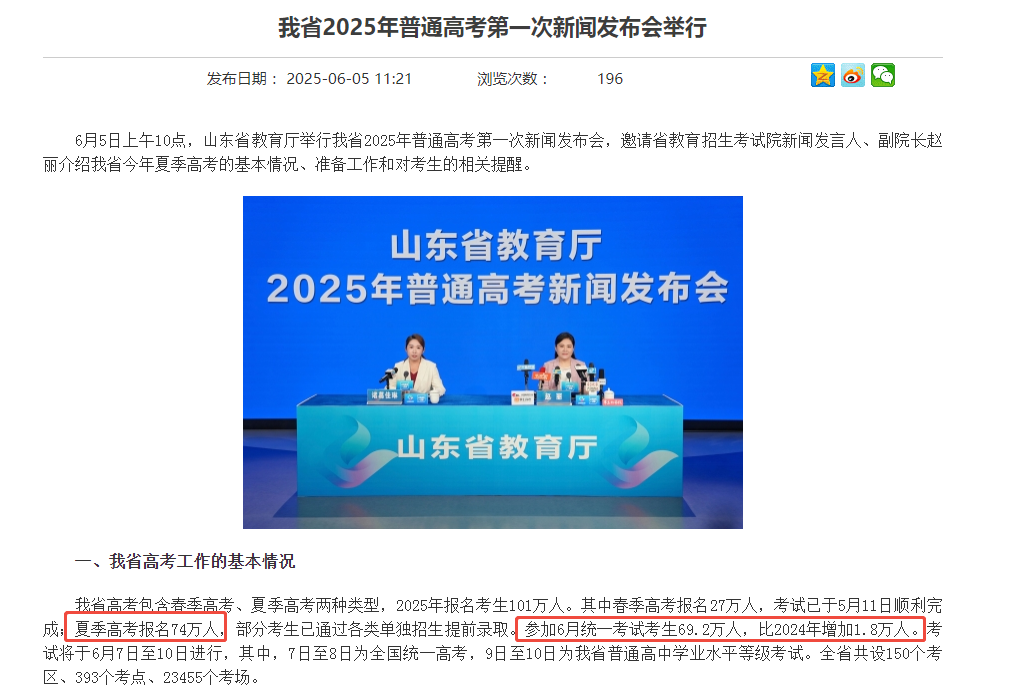 而作为高考大省,2025年山东共有74万考生参与本次夏季高考,考试人数比上年增加1.8万人。