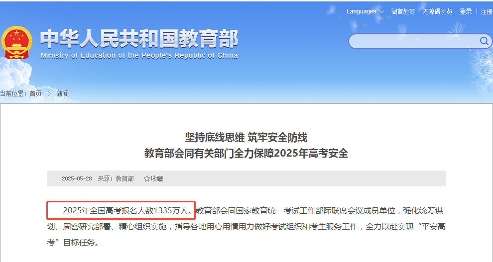 十年寒窗,一朝亮剑。2025年全国高考大幕即将拉开,教育部最新数据显示2025年全国高考报名人数达1335万,虽较2024年减少7万人,但本科录取率预计仅为37.6%,仍有近900万考生将无缘本科。"千军万马过独木桥"的竞争态势依然激烈。