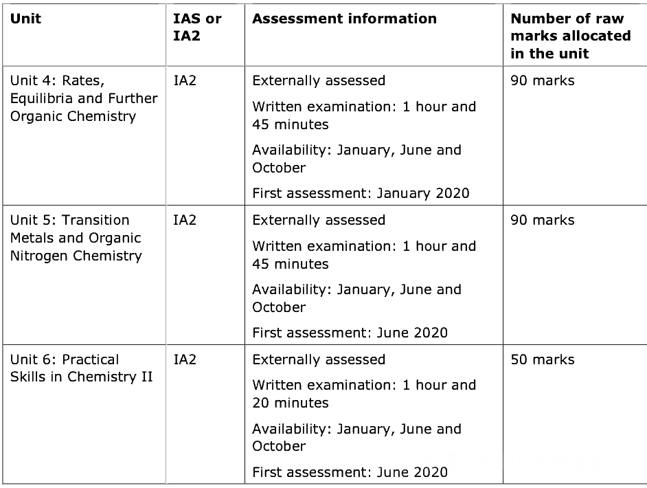 爱得思考试局的A-level化学考试分为6个单元,AS阶段考Unit 1、2、3,A2阶段考Unit4、5、6。