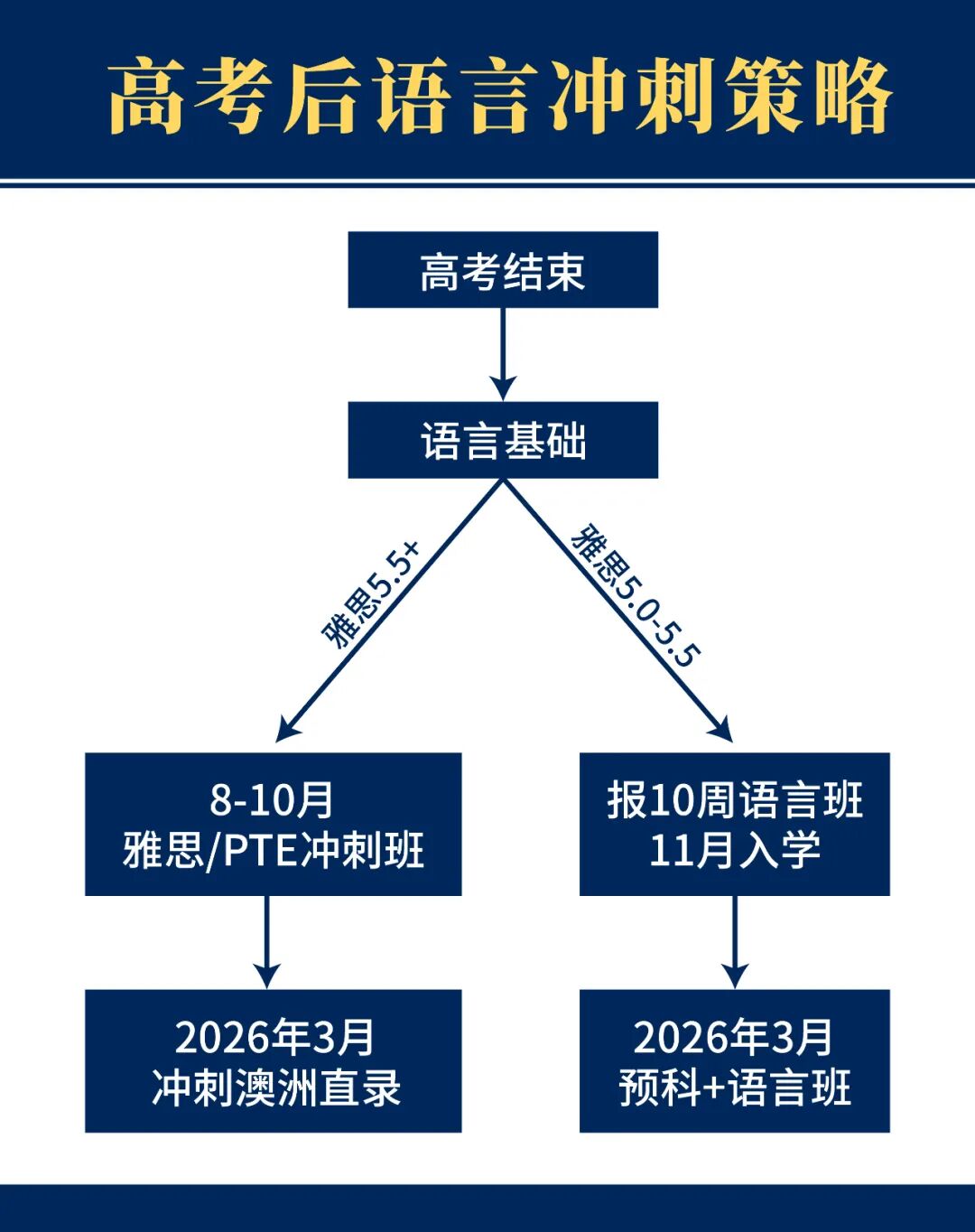 利用高考成绩,搭配3个月的语言培训,无缝衔接2026年3月的澳洲大一课程,是一条高效且极具性价比的路径。