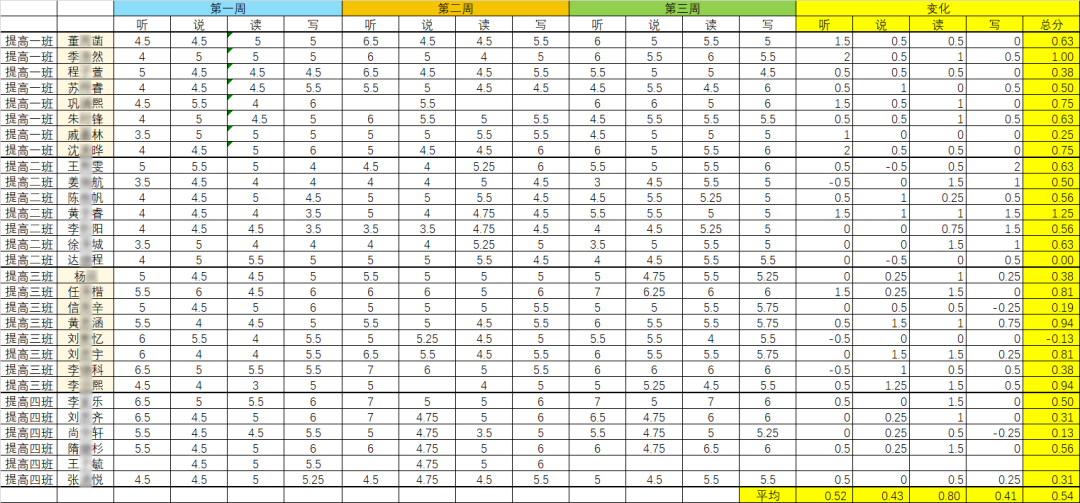 经过三周密集的语言集训,学生们的语言成绩均有不同程度的提升。提高班的29名学生,他们在听说读写四个单项上的平均提升幅度达到了0.4-0.8分,总分平均提升0.5分。这是努力与进步的最好证明。