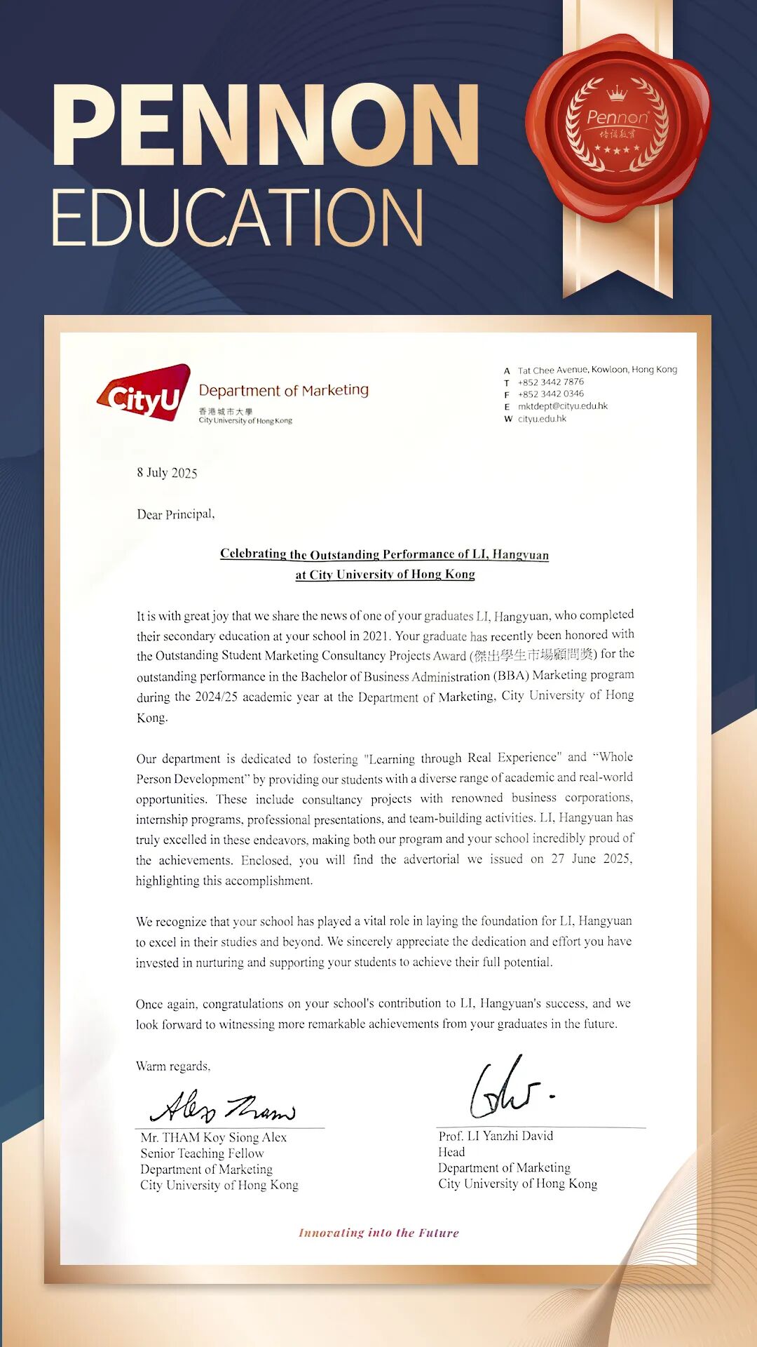 中国香港城市大学特别提及,这份成绩的取得离不开培诺对学生的悉心培养,这份荣誉不仅属于李同学个人,更凝聚着培诺全体教育工作者的心血与智慧,充分彰显出培诺在国际教育领域的卓越育人成果。